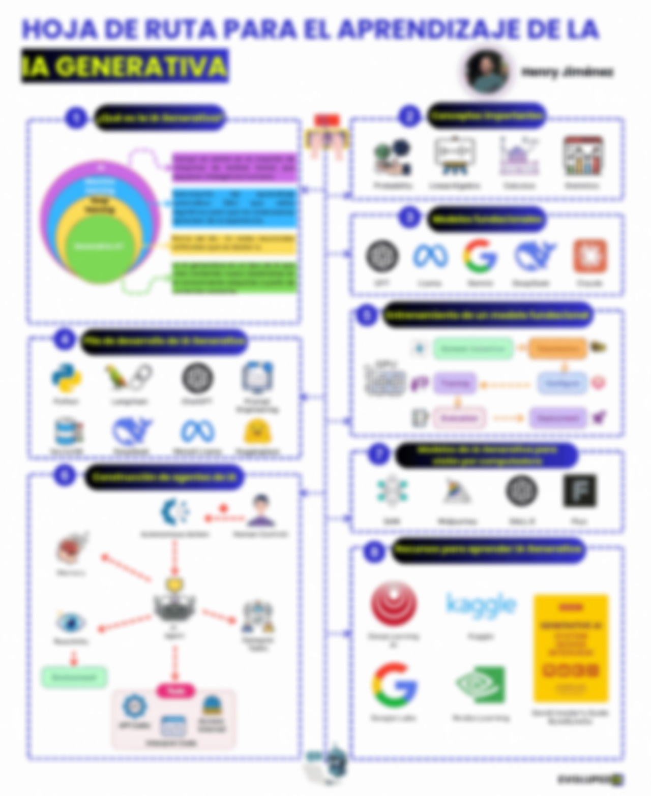 Desde los conceptos matemáticos clave hasta la creación de agentes autónomos o la generación de imágenes, esta hoja de ruta te acompaña en cada etapa de tu proceso de aprendizaje.